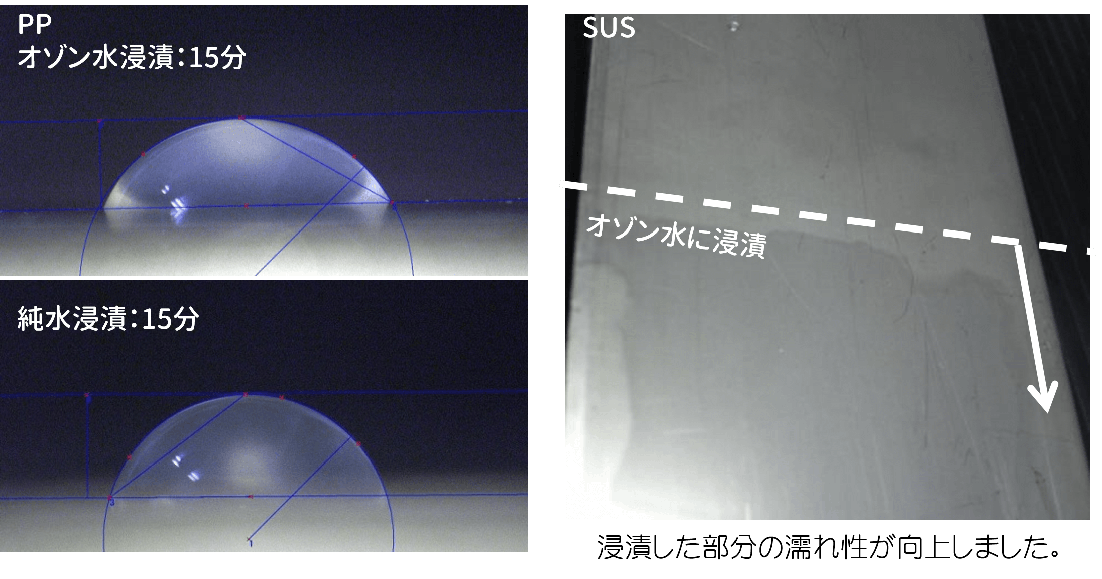 素材表面の親水化処理試験 様々な素材をオゾンB.nano水に浸漬させ、濡れ性の変化を測定しました。